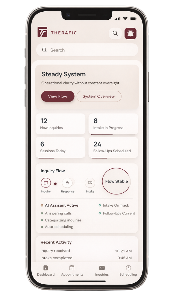 Therafic handles the marketing, the follow-ups, and the intake so your practice grows without burning you out.